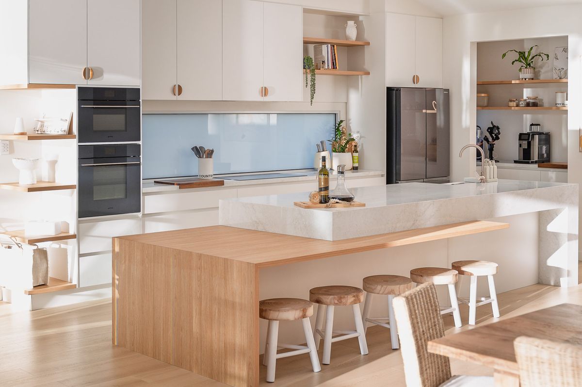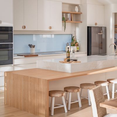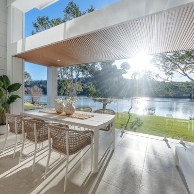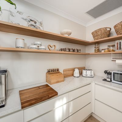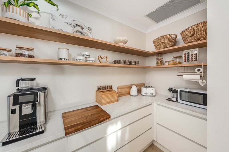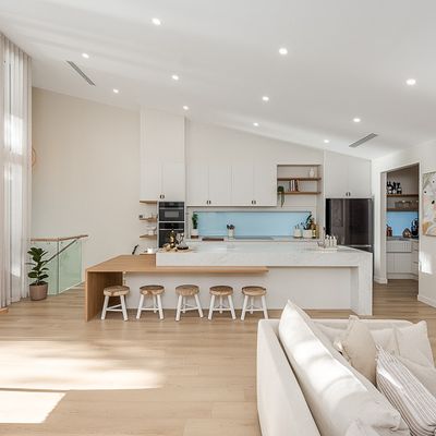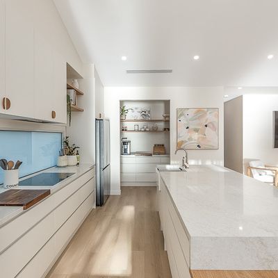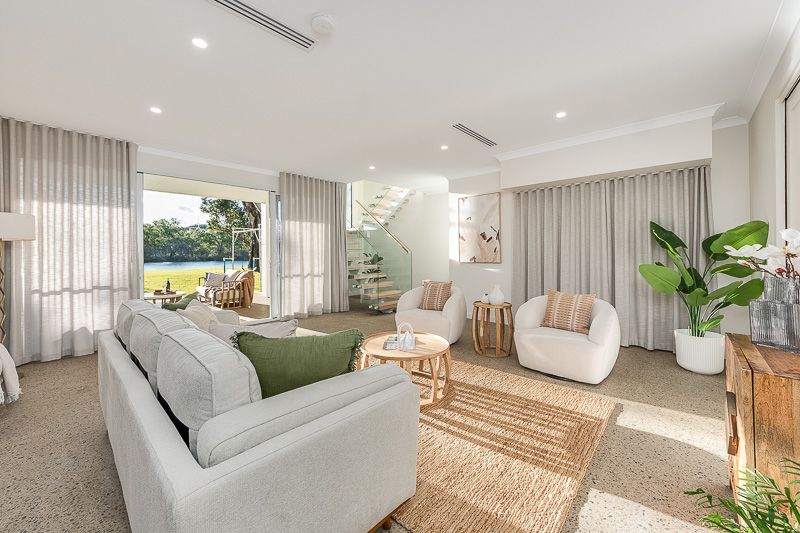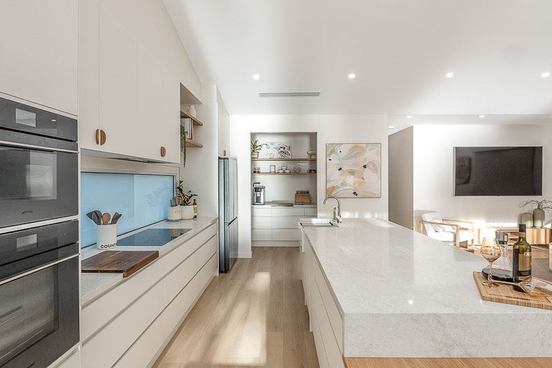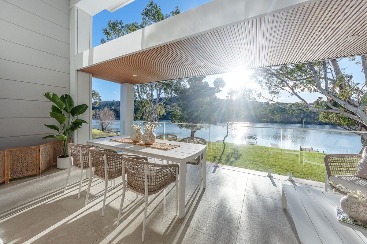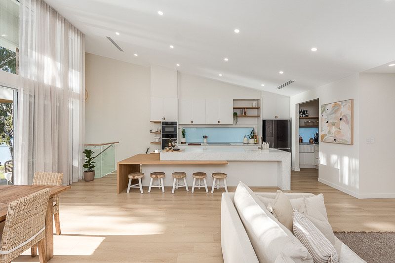 At the heart of the home is an expansive open-plan living area, framed by huge picture windows that capture uninterrupted river views and flood the home with natural light. The designer kitchen is a standout, featuring a butler’s pantry, quality appliances and a generous breakfast bar—ideal for relaxed mornings or entertaining after a day on the water.