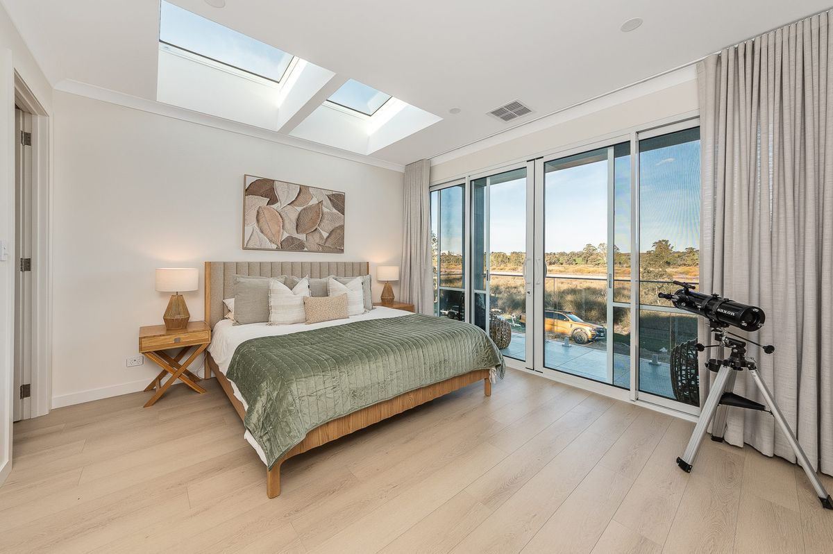 The master bedroom is a private sanctuary, complete with a striking skylight that enhances the sense of calm and connection to the outdoors. The remaining bedrooms are spacious and well-appointed, complemented by three sleek, modern bathrooms.