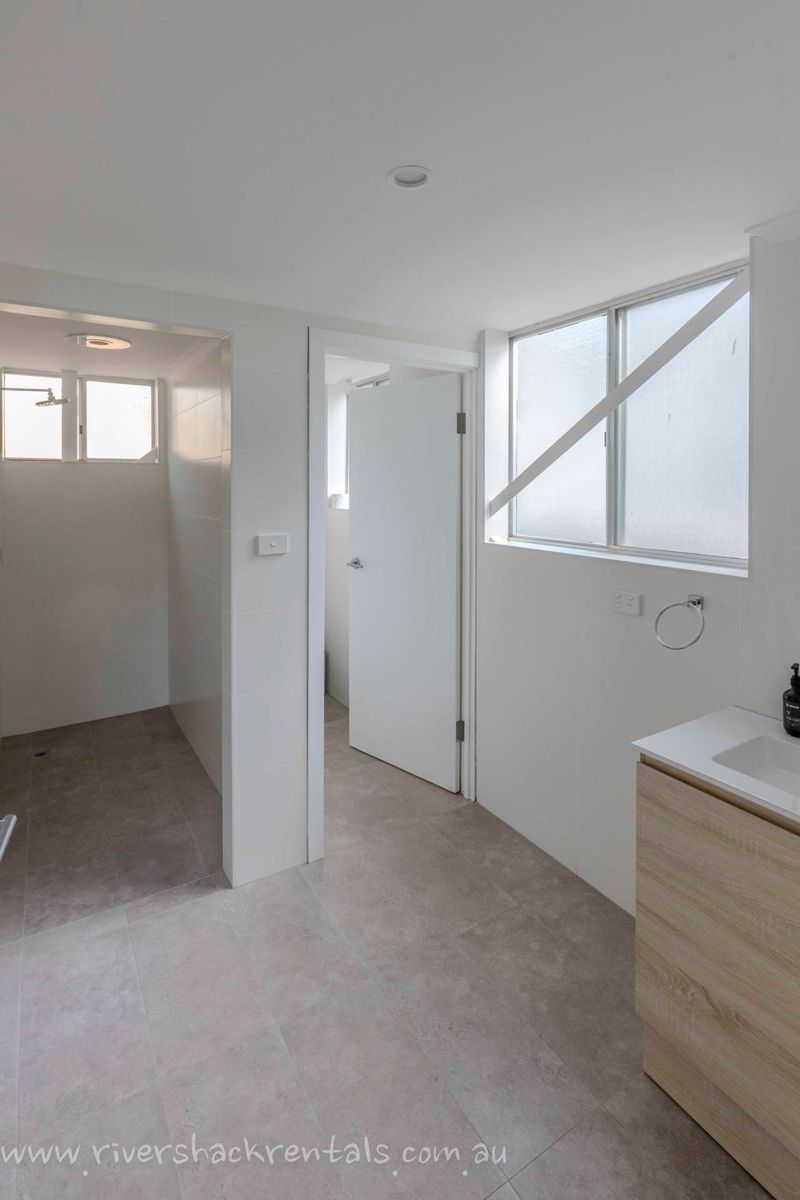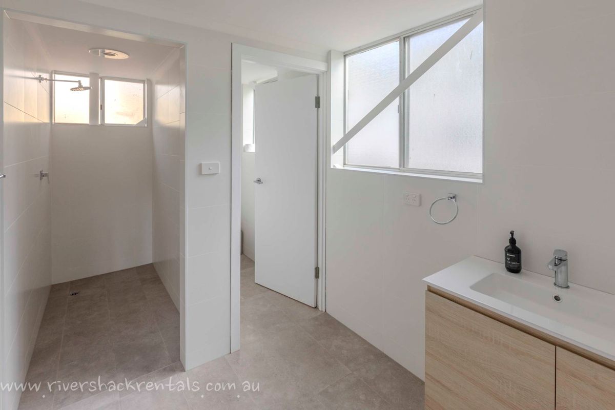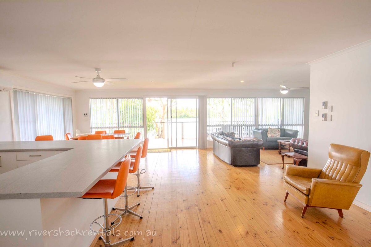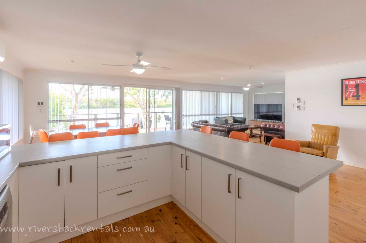 Upstairs, the open-plan kitchen and dining area create a welcoming hub for shared meals and connection. A spacious deck with BBQ overlooks the river, making outdoor dining and sunset drinks a highlight of your stay.