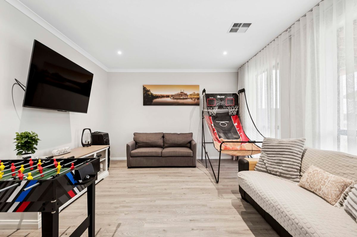 Ultra-Modern Lagoon-Front Retreat – Walker Flat Enjoy the best of modern riverfront living at this brand-new, two-storey, four-bedroom holiday home set on a peaceful lagoon at Walker Flat. With sleek architecture, open-plan living, functional spaces, two lounges, and a games area, it’s designed for families and groups to relax in style. The lagoon offers calm waters for canoeing, sailing, or secure off-river mooring, while nearby River Murray access keeps adventure close. Outdoors, a large lawned area and ample parking make it easy to bring boats and gear. Located within the Dark Sky Reserve, it’s perfect for stargazing, fishing, or photography, making every stay unforgettable.